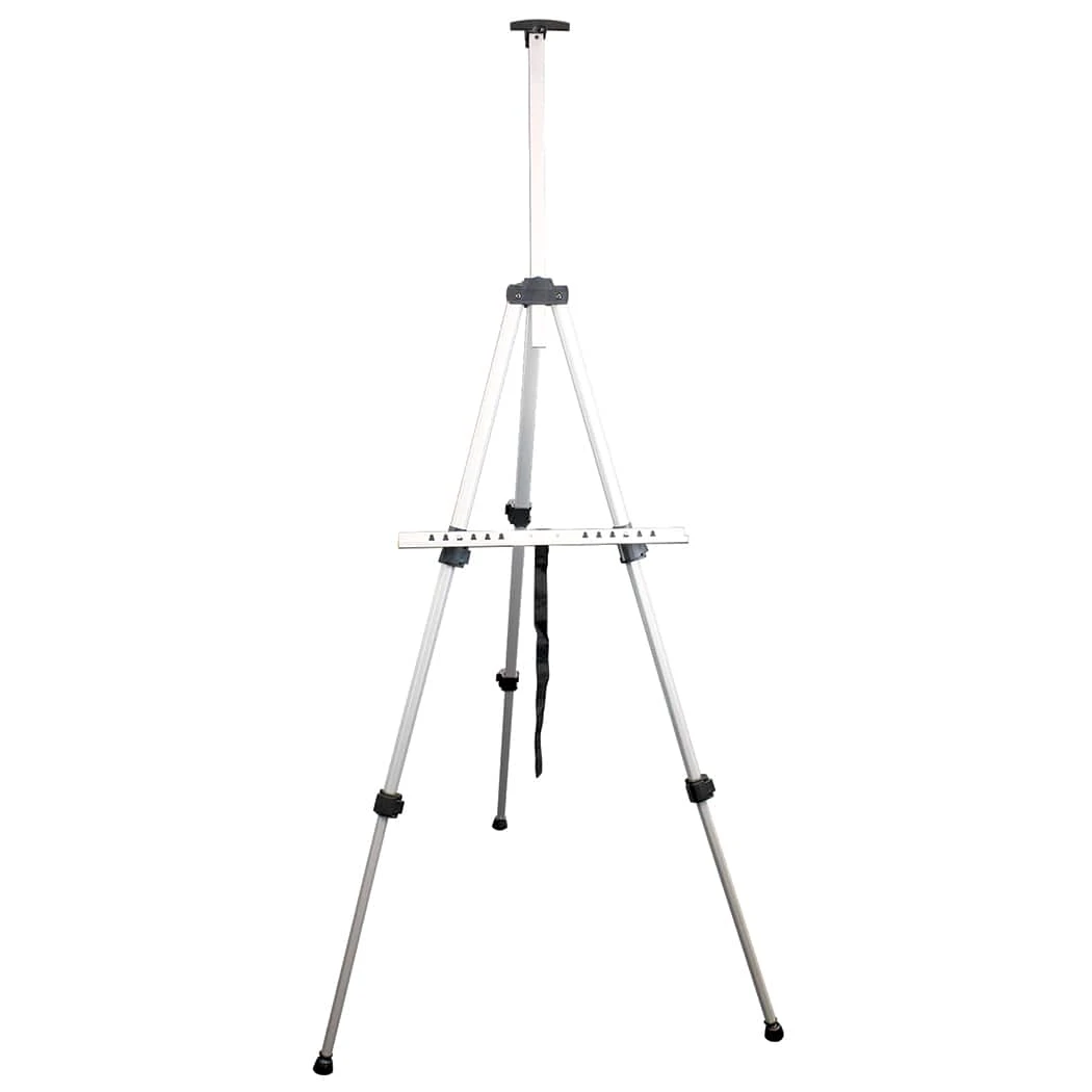 Light weight and adjustable to use while sitting, standing or placed on a table, the Tilden easel is great for travel. Made of light-weight aluminum, it weighs just 2 lbs. but can accommodate canvases or panels up to 32″h x 1″d. A spring-loaded top clamp secures canvases in place and the telescoping legs with non-skid rubber feet are easily adjusted. The fully extended height is 65″ and it folds to 21.5″ x 4.25″ x 3″ for easy storage and transport. The base, when fully extended, creates a 36″ x 38″ x 38″ triangle. It includes a carrying case with shoulder strap.