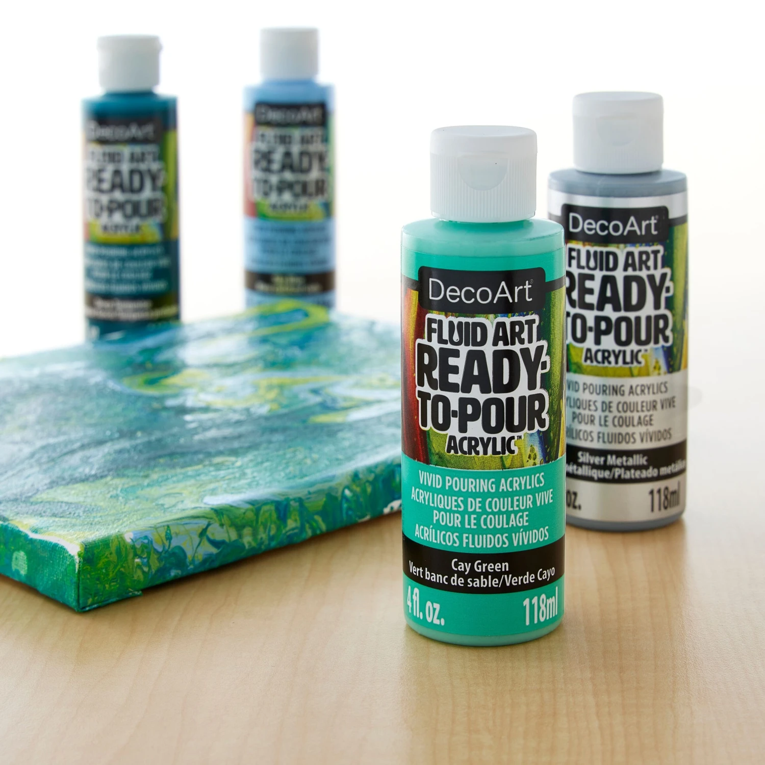 These highly-pigmented, ready-to-pour paints are the perfect consistency for creating unique and layered paint pours in one step. They’re designed to flow easily and don’t need to be mixed with any mediums or additives. The colors in this pack include: Deep Turquoise, Cay Green, Sky Blue, and Silver Metallic.