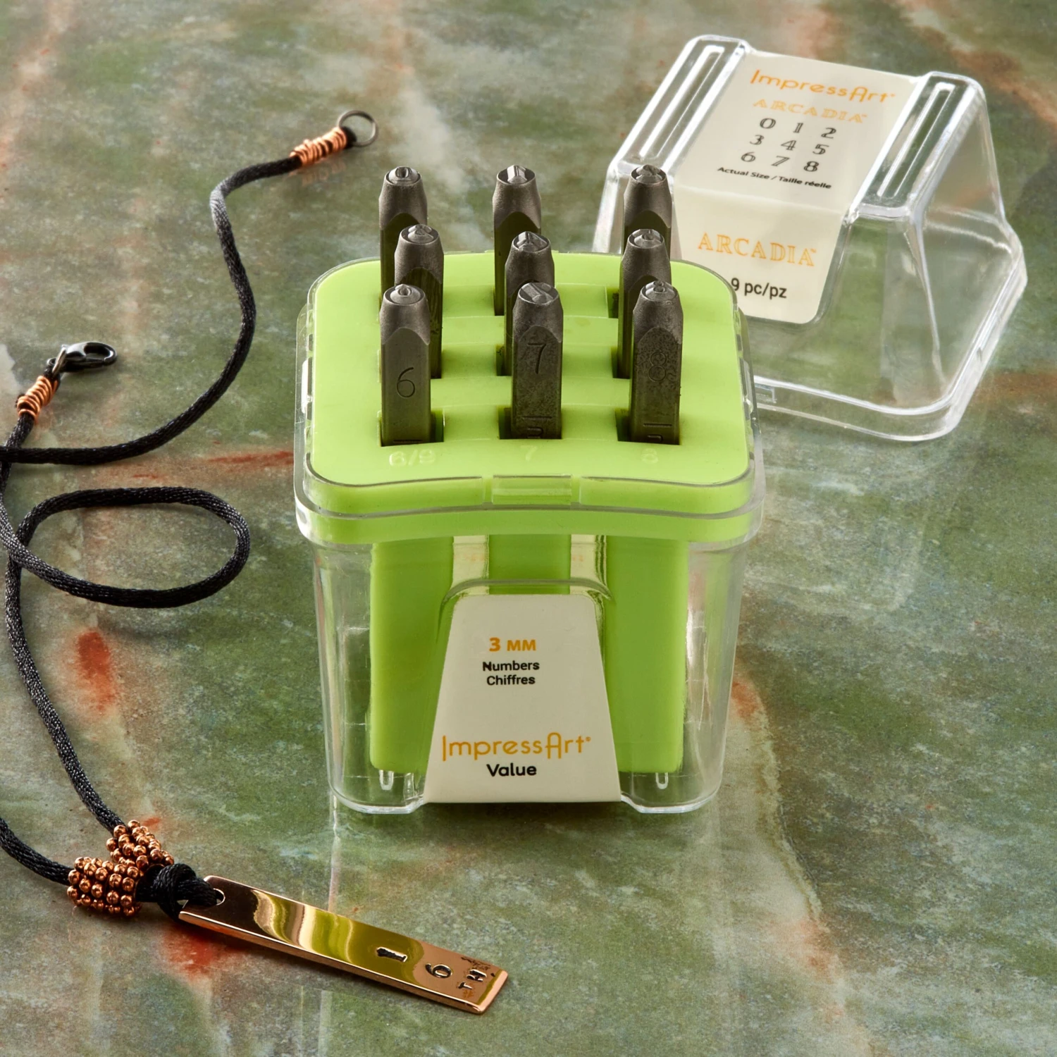 This number stamp set from ImpressArt will come in handy to customize your metal stamping blanks. You can use it to stamp numbers on your blank bracelet strips, washers, pewter tags and more. The included metal stamps are also numbered on their sides for quick identification. This stamp set comes in a sleek storage case with numbered slots for easy organization.