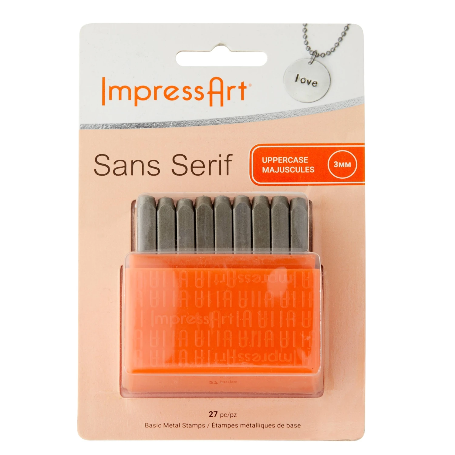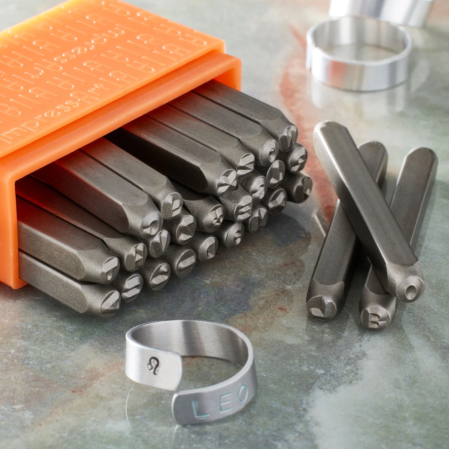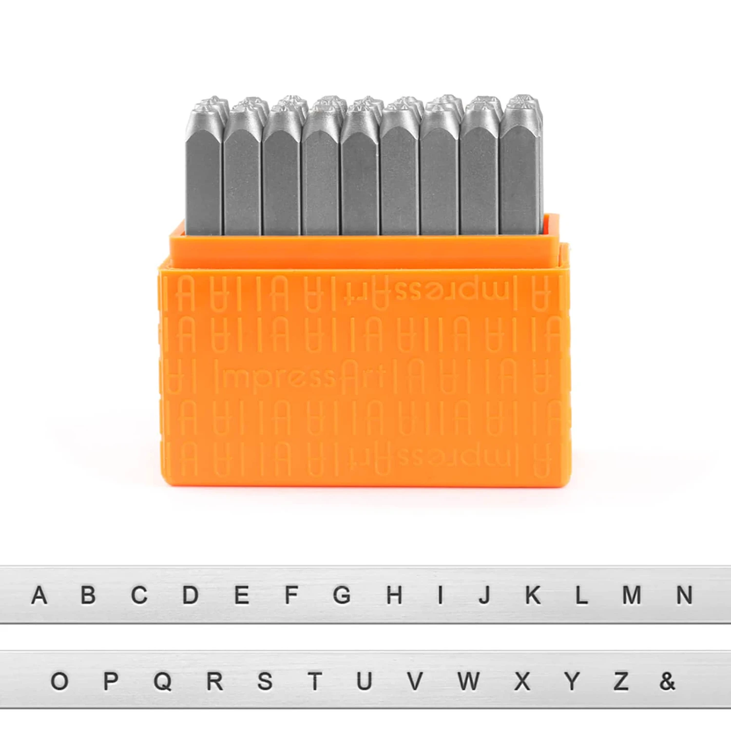Use this letter stamp set from ImpressArt to stamp your name or favorite phrase on metal stamping blanks. The metal stamps feature uppercase alphabets from A to Z, along with the ampersand symbol. This stamp set is perfect to make hand-stamped jewelry or keepsakes.