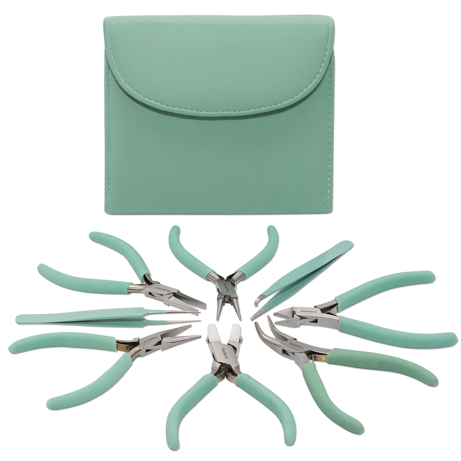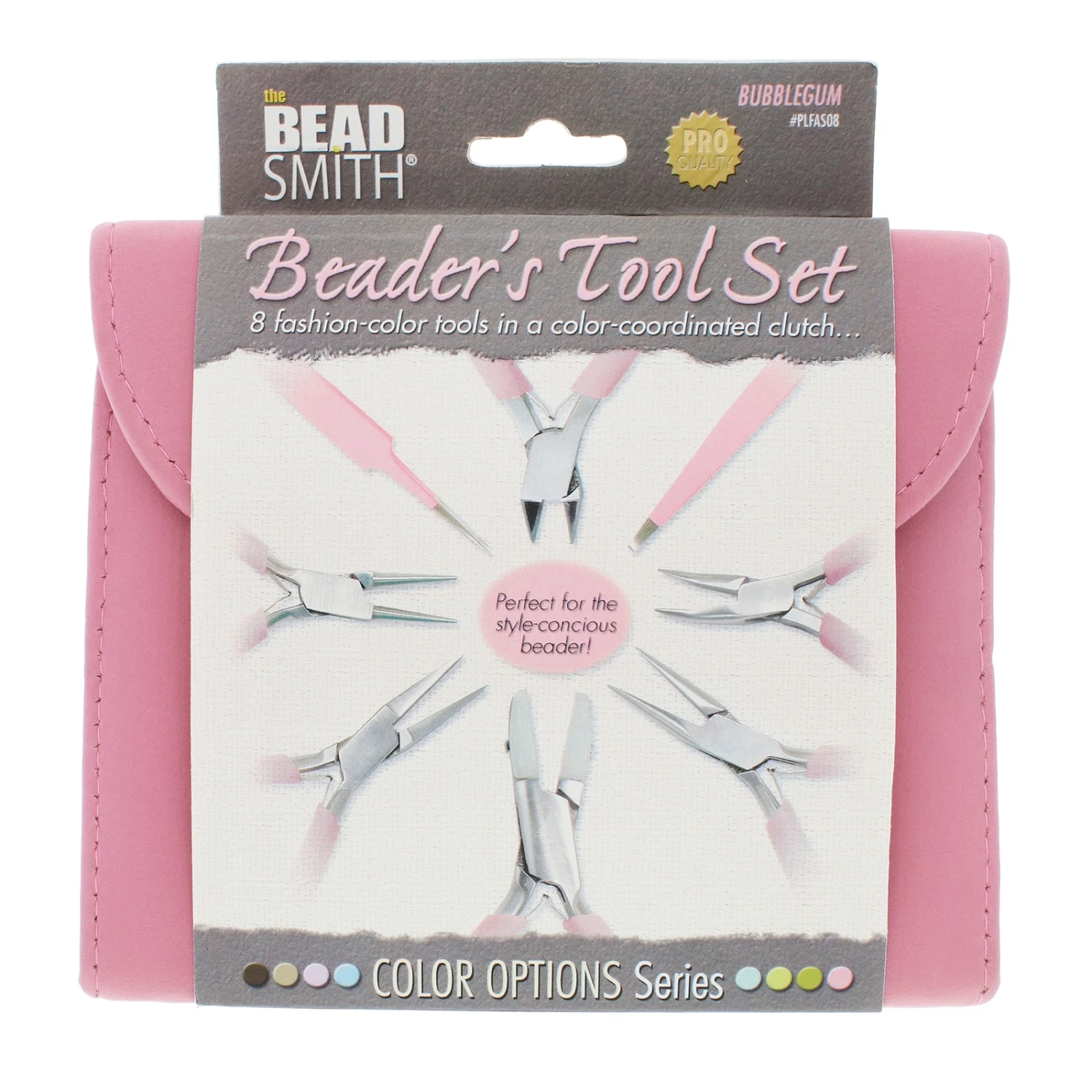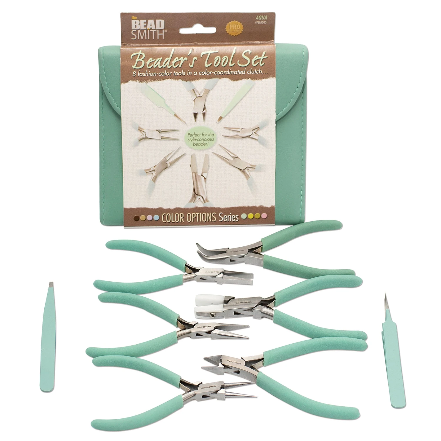 Tools in your Favorite Vibrant Colors! Features 8 fashion-color tools in a color-coordinated clutch… Perfect for the style-conscious beader! Each set contains the following tools: Chain Nose Plier; Bent Chain Nose Plier; Flat Nose Plier; Round nose , Cutter, Nylon Jaw Flat knotting Tweezer and split ring Tweezer.
