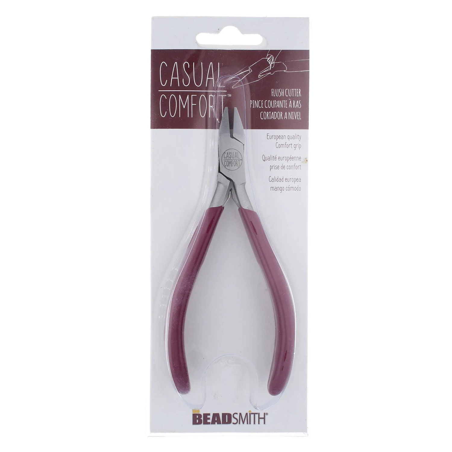 The Casual Comfort line of tools from The Beadsmith are ergonomically designed and a must have for a beader’s tool kit. The handles feature a soft vinyl grip for comfortable use, ideal for repetitive tasks. Flush cutters may be used to trim soft craft wire, head pins, and eye pins. They are NOT suitable for cutting memory wire, flex wire, or steel wire. They can fit into tight places and will produce a flat, even cut so less filing and cleanup is needed. Cut with the concave side of the cutters facing the waste end of your wire so the flush cut wire end is on your project.