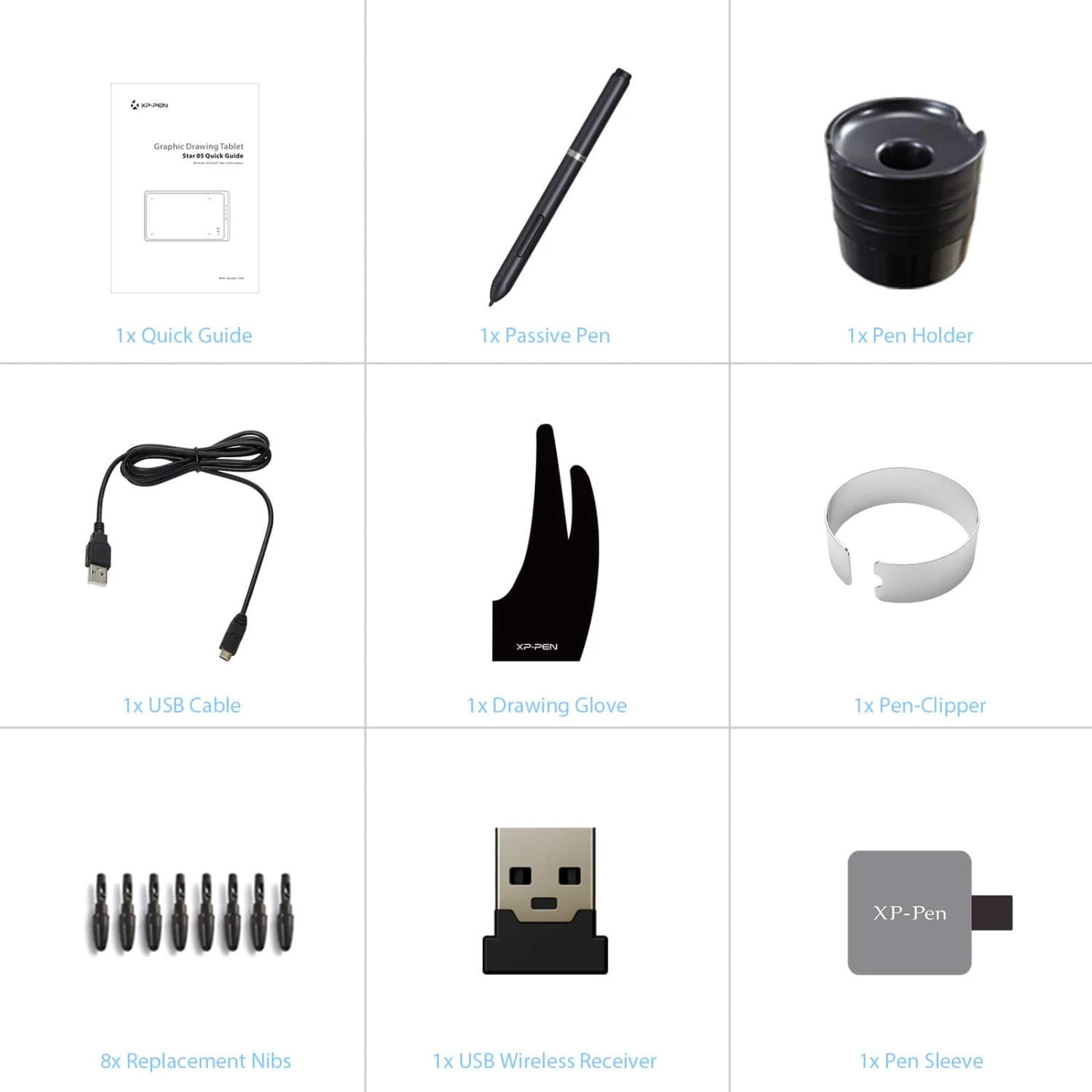 - 8 Pen nibs (Located in pen holder)